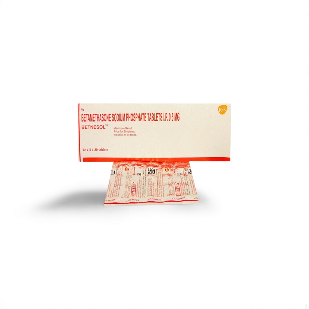 Betnesol 0.5 mg tablets contain betamethasone dipropionate, a potent systemic corticosteroid indicated for short-term management of acute inflammatory and autoimmune disorders. By binding to glucocorticoid receptors, it modulates gene transcription to suppress pro-inflammatory cytokines (e.g., IL-1, TNF-ฮฑ) and inhibit leukocyte infiltration. Clinicians reserve this lower-dose tablet for patients requiring gentler systemic dosing, such as pediatric, elderly, or those with milder flares of conditions like severe atopic dermatitis, certain dermatological autoimmune manifestations, and other steroid-responsive diseases.