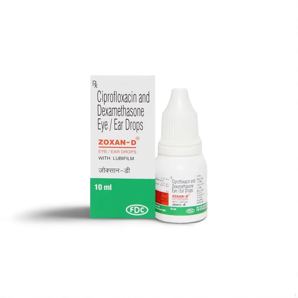 Zoxan D Eye/Ear Drops combine Ciprofloxacin, a potent fluoroquinolone antibiotic, with Dexamethasone, a corticosteroid that reduces inflammation. This dual therapy treats bacterial infections of the eye (conjunctivitis, keratitis) and ear (otitis externa), while simultaneously reducing swelling, redness, and discomfort.