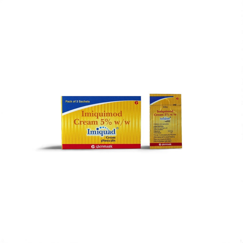 Imiquad Sachet delivers a 5% imiquimod cream in pre-measured 0.25 g packets designed for precise topical application. Imiquimod is an immune response modifier that stimulates Toll-like receptor 7, inducing cytokines (IFN-ฮฑ, TNF-ฮฑ, IL-12) to promote antiviral and antitumor activity.