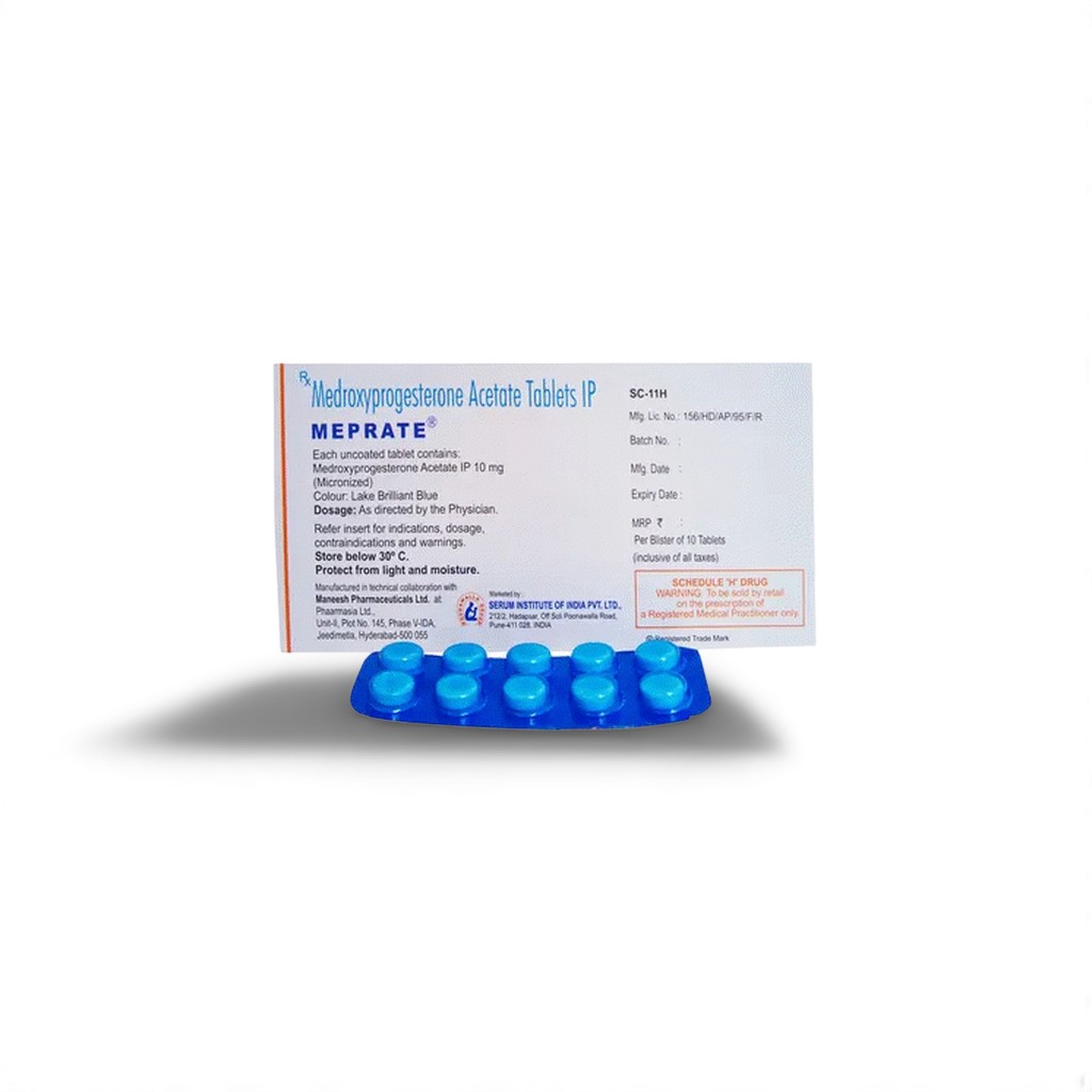Meprate 10 mg contains medroxyprogesterone acetate, a synthetic progestin widely used to treat amenorrhea, endometrial hyperplasia, and as part of hormone replacement therapy (HRT). Manufactured by Serum Institute India, Meprate is also prescribed in reproductive health protocols to regulate menstrual cycles and provide endometrial protection when estrogen alone is used.