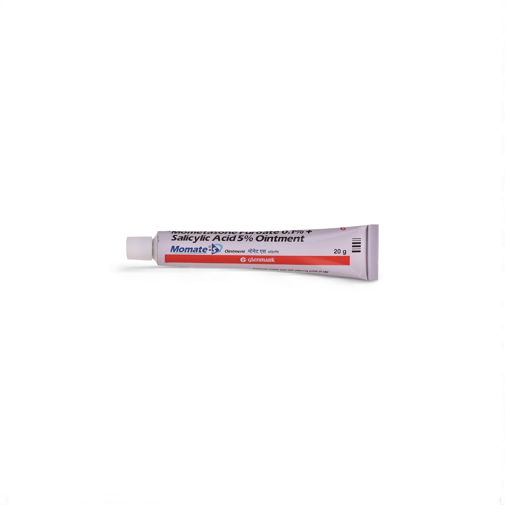 Momate S Ointment combines a potent topical corticosteroid (Mometasone Furoate 0.1%) with Salicylic Acid 3%, a keratolytic agent. This formulation is tailored for thickened, scaly, and itchy skin conditions like plaque psoriasis and lichenified eczema. Mometasone reduces inflammation, pruritus, and erythema by modulating pro-inflammatory cytokines, while Salicylic Acid facilitates the removal of excessive keratin, enhancing corticosteroid penetration and reducing scaling.