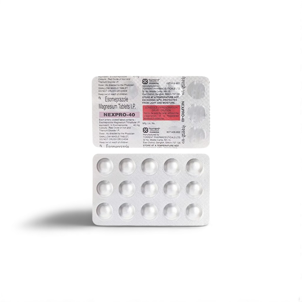 Esomeprazole 40 mg GERD, erosive oesophagitis, ulcer prophylaxis, Z‑E syndrome Nexium® 40 mg Torrent Pharma, India (Est. 1959) 15 tablets / strip 40 mg 6 – 15 days