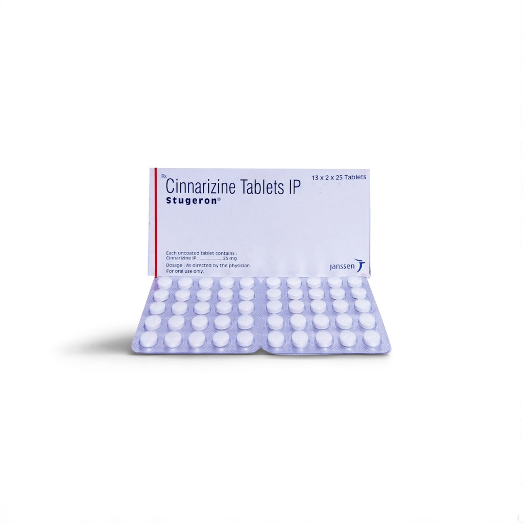 Stugeron 25 mg by Janssen Pharmaceuticals, India, contains the antihistamine Cinnarizine, commonly prescribed for motion sickness, vertigo, and balance disorders. It works by stabilizing the inner ear and preventing nausea, dizziness, and vomiting caused by disrupted signals in the vestibular system.