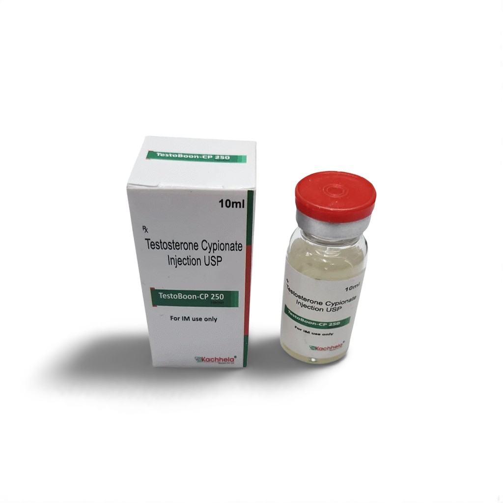 TestoBoon CP 250mg is a long-acting injectable form of testosterone cypionate, primarily used in the treatment of male hypogonadism and testosterone deficiency. Manufactured by Kachhela Medex Pvt. Ltd., this formulation is ideal for individuals undergoing hormone replacement therapy (HRT), athletes, and bodybuilders under clinical supervision.