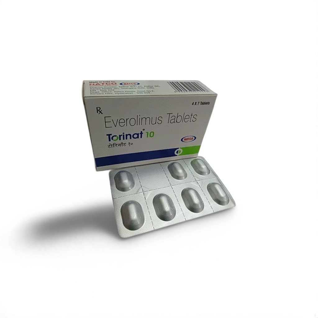 Torinat 10 mg contains everolimus, a potent mTORC1 inhibitor used for immune suppression post-transplant and as targeted therapy in advanced cancers. Produced by Natco Pharma Ltd, its applications include renal cell carcinoma, breast cancer, neuroendocrine tumors, and TSC-associated conditions (mrmed.in, dailymed.nlm.nih.gov). Its generic formulation offers affordability without compromising on clinical efficacy.